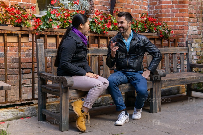 Молодой мужчина и женщина разговаривают, сидя на скамейке на открытом воздухе