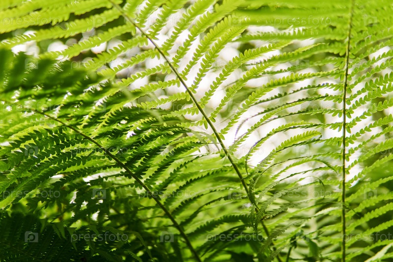 Вид на заросли папоротника в подлеске леса снизу вверх