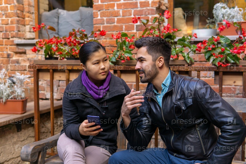 Европейский молодой человек разговаривает с азиатской девушкой, держащей смартфон