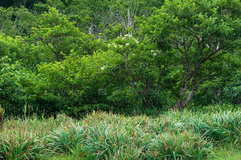 Лесной пейзаж острова Кунашир, цветущий кустарник и подлесок высокой травы