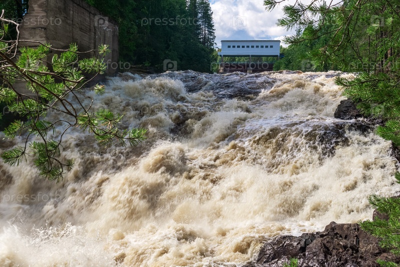 Водопад во время открытия шлюзов для холостого сброса воды на малой ГЭС