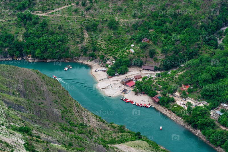 Вид сверху на горную реку Сулак в Дагестане с туристической лодочной базой