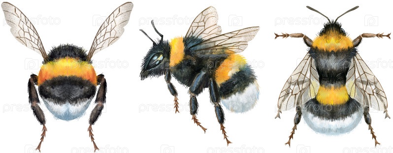 Набор земных шмелей. Насекомое для графики на футболках. Акварельная иллюстрация шмеля