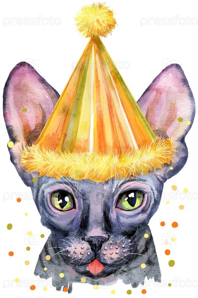 Прекрасный портрет крупного плана в пастельных тонах породы кошек сфинкса. Ручная акварельная живопись на белом фоне