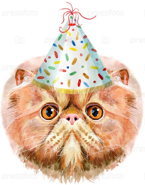 Милый кот в праздничной шляпе. Кот для графики на футболках. Акварельная иллюстрация породы экзотических короткошерстных кошек