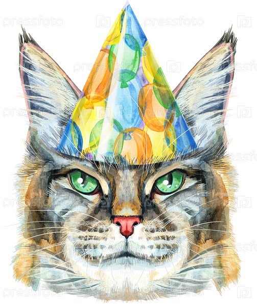 Милый кот в праздничной шляпе. Кот для графики на футболках. Акварельная иллюстрация породы кошек Мейн Кун