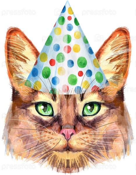 Милый кот в праздничной шляпе. Кот для графики на футболках. Акварельная иллюстрация породы сомалийской кошки