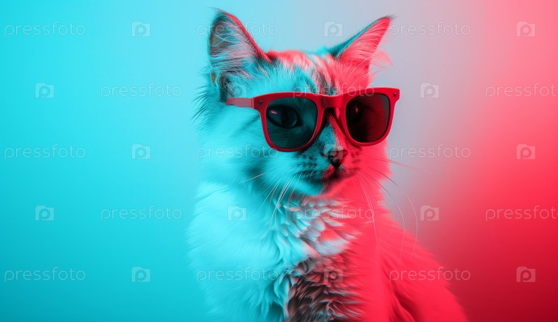 Белый кот в розовых очках на двухцветном фоне