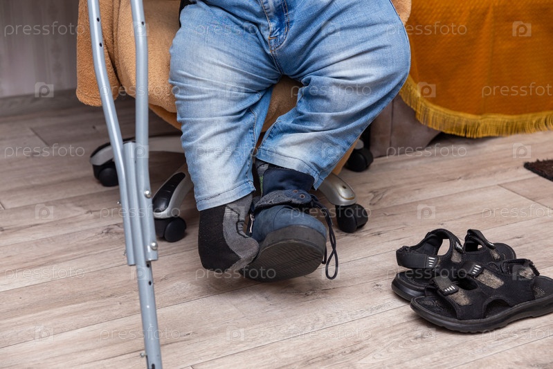 Человек с врожденной инвалидностью надевает обувь, сшитую на заказ, чтобы выйти на улицу