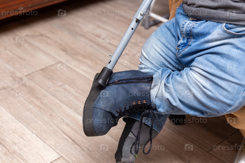 Человек с врожденной инвалидностью надевает обувь, сшитую на заказ, чтобы выйти на улицу