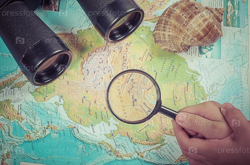 Фон на тему путешествий- карта мира, бинокль, лупа в руках