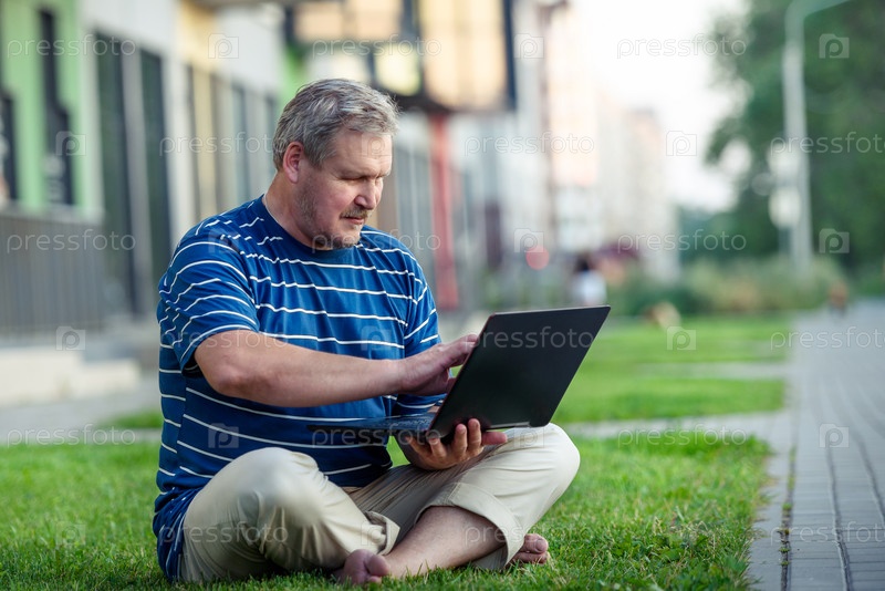 Счастливый мужчина ищет онлайн-контент на ноутбуке, сидя на лужайке в летний день в городе