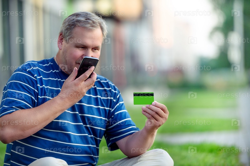 Мужчина находит на городской лужайке предложения электронной коммерции о покупке онлайн с помощью телефона и кредитной карты