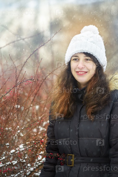 Портрет красивых девушек в зимнем парке у Буша с красными ягодами. Яркие огни и снег