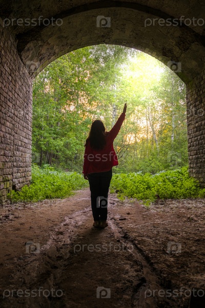 02 июня 2023 г. - Казань, Россия: Девушка идет по темному туннелю к выходу. Свет в конце туннеля
