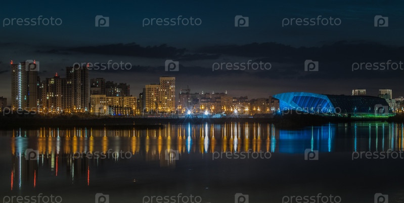 Жилой район Казани и Дворец водного спорта, отраженные в водах реки Казанки. Россия