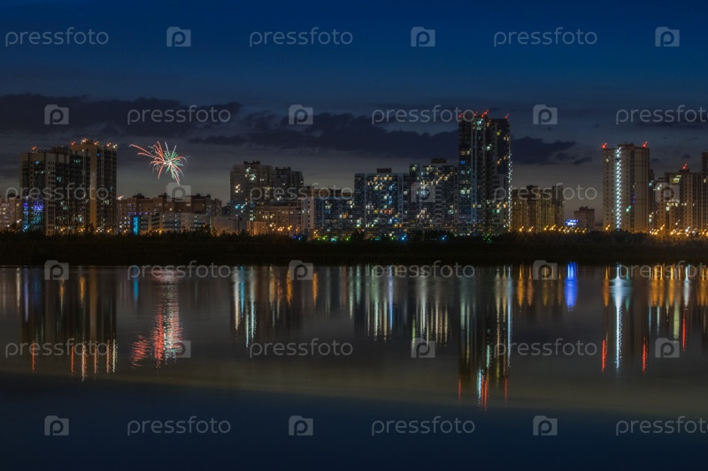 Жилой район Казани ночью, отражающийся в водах реки Казанки. Россия. Небольшой фейерверк над городом