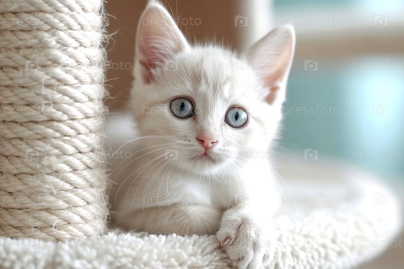Белый котенок с голубыми глазами лежит в кошачьем домике рядом с когтеточкой