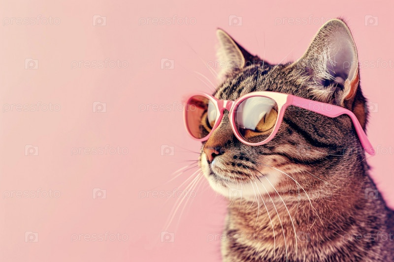 Крупный план полосатого кота в розовых очках на розовом фоне с копировальным пространством, смотрящим в сторону