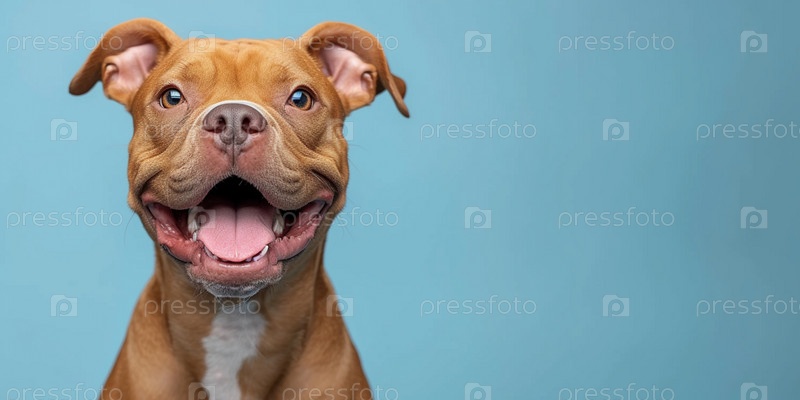 Портрет взволнованной собаки американского булли в полный рост на сплошном пастельно-голубом фоне