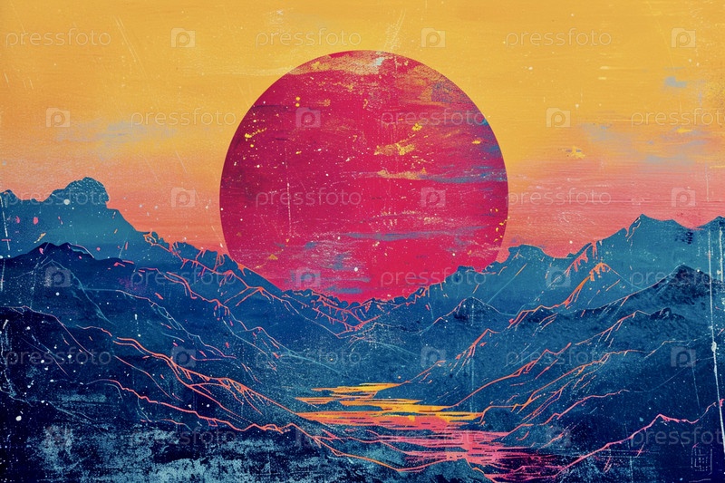 Красное восходящее солнце среди голубых гор, пейзаж в стиле ризографа