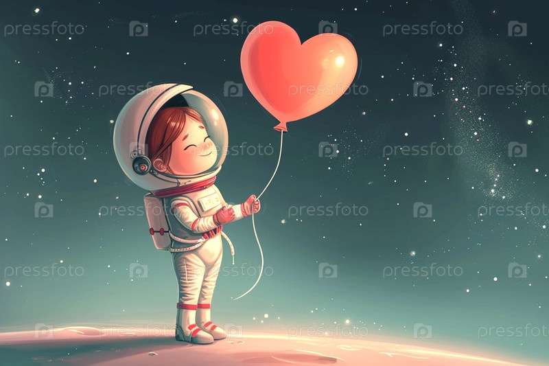 Счастливая мультяшная девушка-космонавт с воздушным шаром в форме сердца