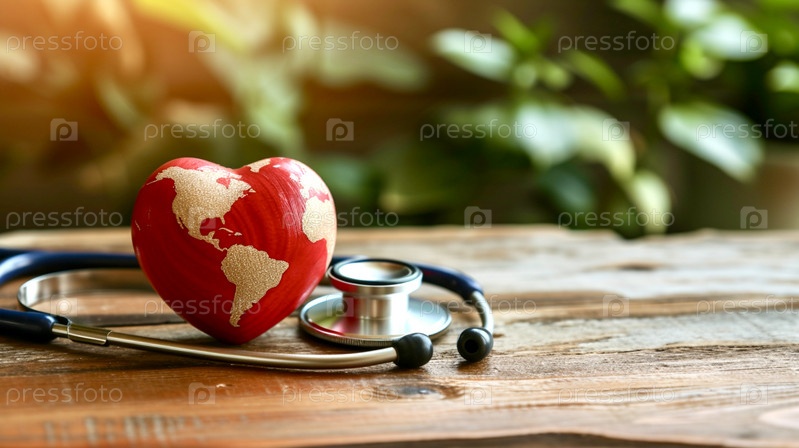На деревянном столе лежит деревянное красное сердце и фонендоскоп на фоне размытой зелени