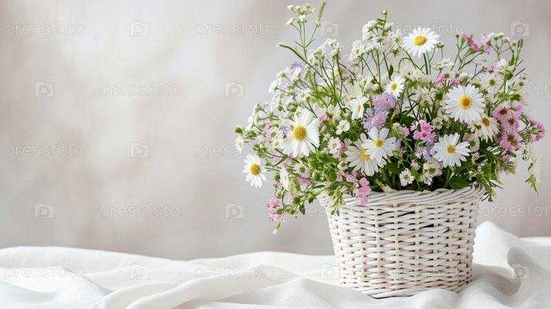 В белой плетеной корзине на белой скатерти стоят весенние цветы, ромашки и колокольчики