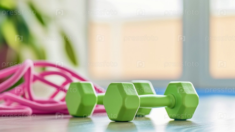 Зеленые гантели и розовая скакалка лежат на ярком, чистом полу