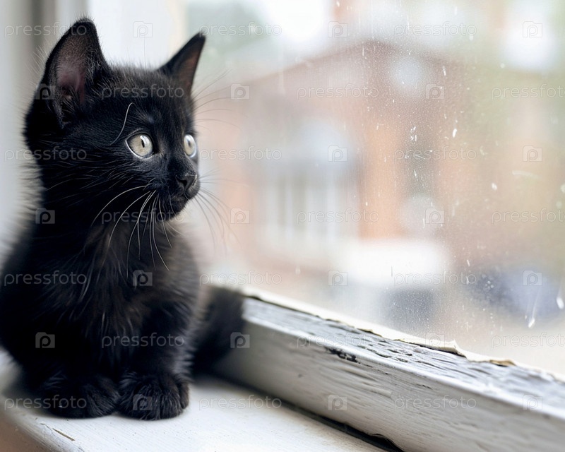 Черный пушистый котенок сидит на подоконнике дома и смотрит на улицу
