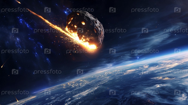 Метеорит летит в космосе и оставляет за собой горящий след