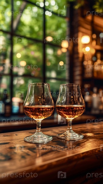 Два бокала коньяка на деревянном столе в баре с окном на заднем плане