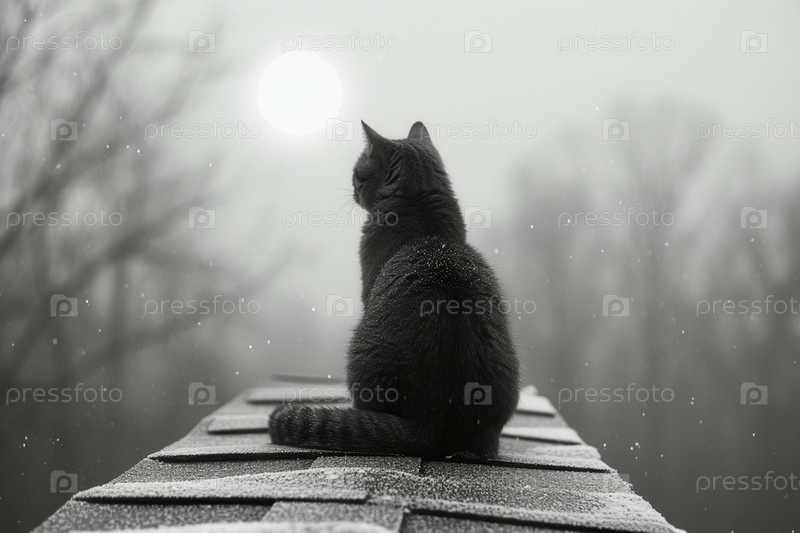 Монохромный стиль, избирательный фокус, пушистый кот сидит на крыше в пасмурный день и смотрит на солнце, выглядывающее сквозь серые облака
