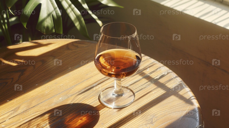 Бокал коньяка на деревянном столе в лучах заходящего солнца в стиле минимализма и ретро на фоне зеленого растения