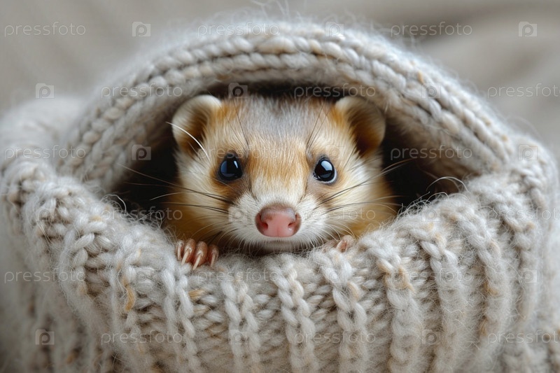 Милый рыжий хорек торчит из рукава вязаного свитера