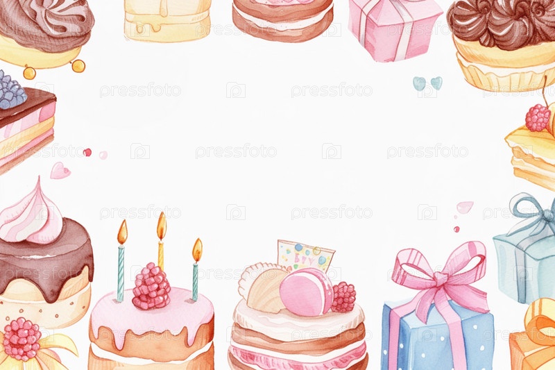 Рамка со свободным местом для текста, сделанная из разнообразных цветов, свечей, подарочных коробок с большими бантами в акварельном стиле