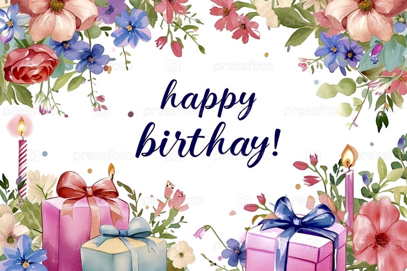 Пастельная рамка с текстом «С днем рождения» из разнообразных цветов, свечей, подарочных коробок с большими бантами в акварельном стиле