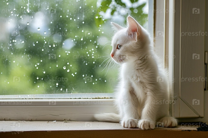 Белый пушистый котенок сидит на старом подоконнике в доме и смотрит в окно на летний дождь