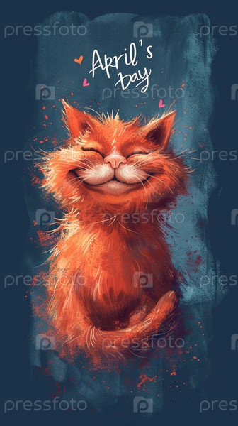 Рыжий апрельский счастливый кот на темно-синем фоне в стиле акварели, вертикальный