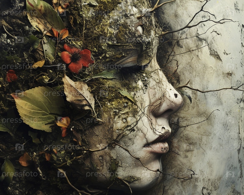 Крупным планом лицо молодой девушки-природы, заросшей цветами, травой и деревьями