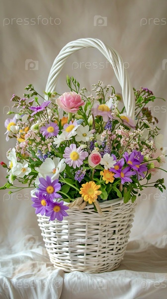 Белые, фиолетовые и желтые ромашки, стоящие в белой плетеной корзине на фоне белой ткани, вертикальное фото