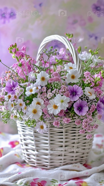В белой плетеной корзине букет весенних нежных цветов на разноцветной скатерти на столе, вертикальное фото