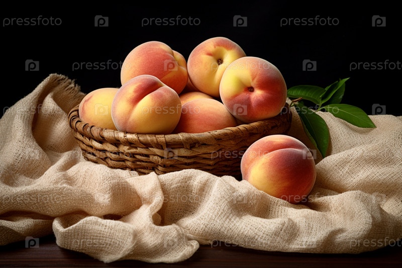 На деревянном столе лежит льняное бежевое полотенце, на котором стоит корзина со спелыми персиками