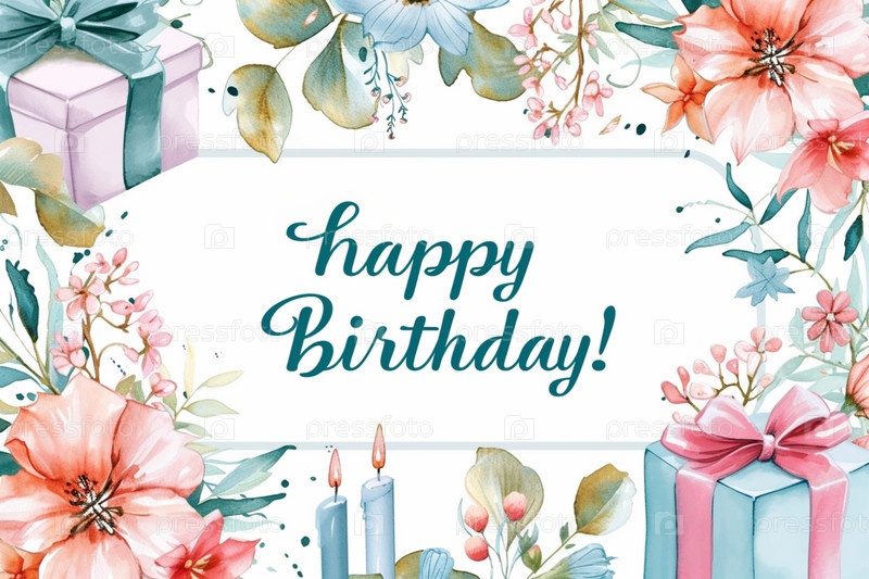 Открытка с текстом с днем рождения из разнообразных цветов, свечей, подарочных коробок с большими бантами в акварельном стиле