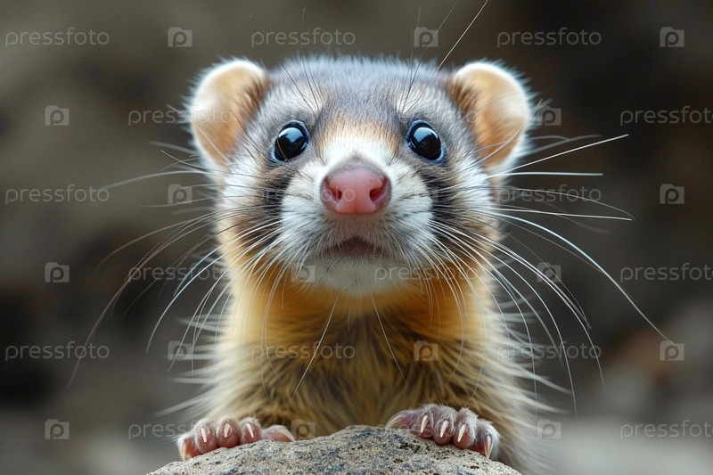 Любопытное лицо хорька высунулось из-за камня, крупный план, выборочный фокус