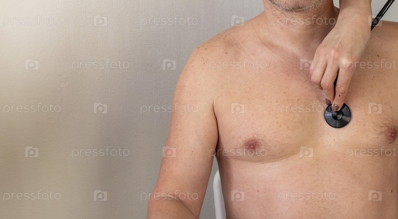 Снимок женщины-врача в форме на фоне белой стены, осматривающей пациента мужского пола среднего возраста. Здравоохранение