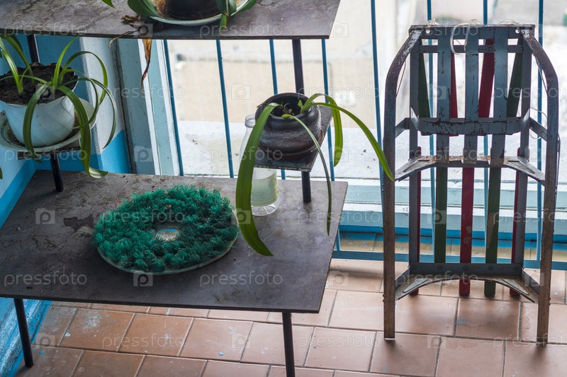 Концептуальный снимок коридора советской эпохи в здании с растениями и санями. Концепция
