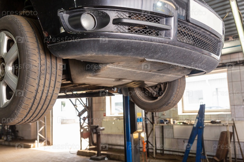 Автомобиль поднят на автоподъемник в автосервисе