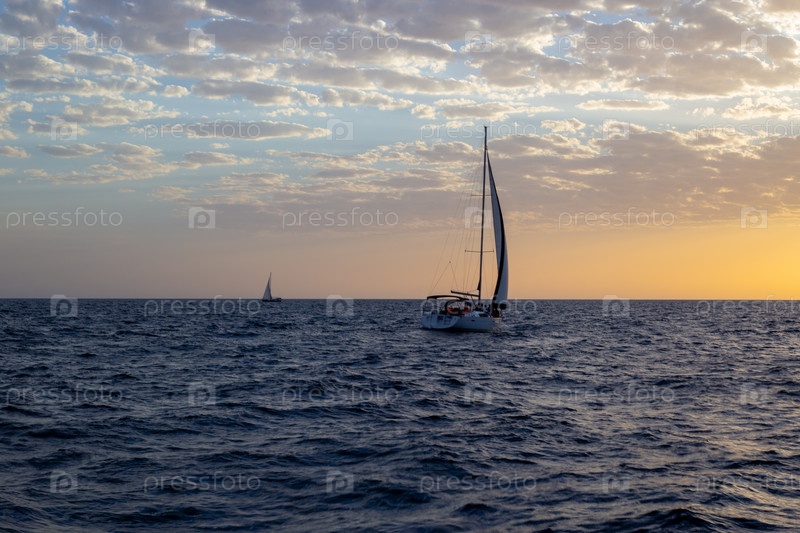 Две парусные яхты на фоне моря и облаков во время заката