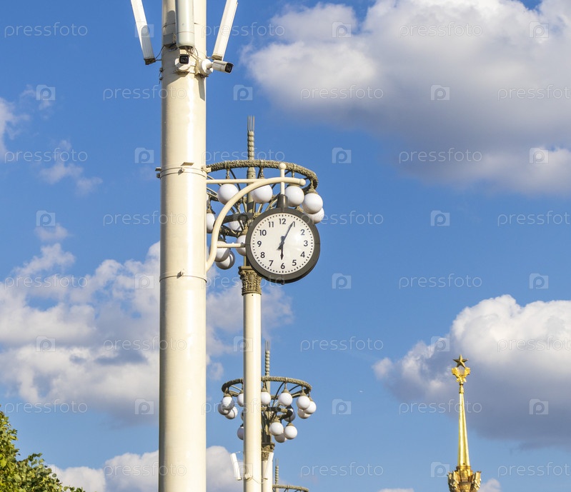 Крупный план уличных часов на фонарном столбе. Город